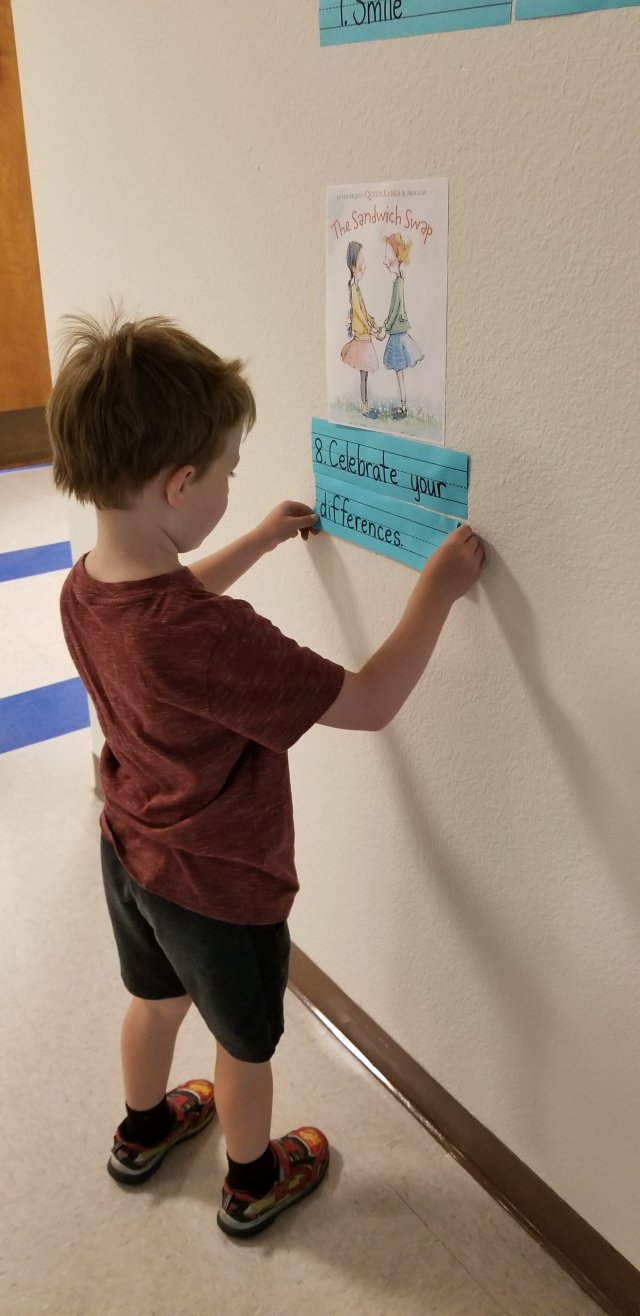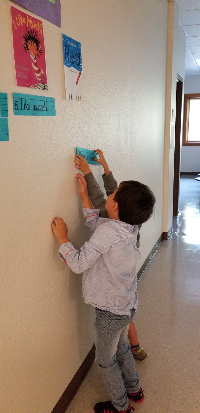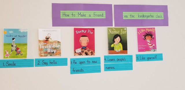 Each morning we read a book and the kids post a picture of the cover and the message in the lunchroom.